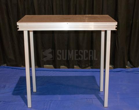 Plataforma con estructura (marco) de aluminio, con soporte en las esquinas para encajar los diferentes pies (fijos o telescópicos) o ruedas. Guía perimetral para la instalación simple de los diferentes accesorios.